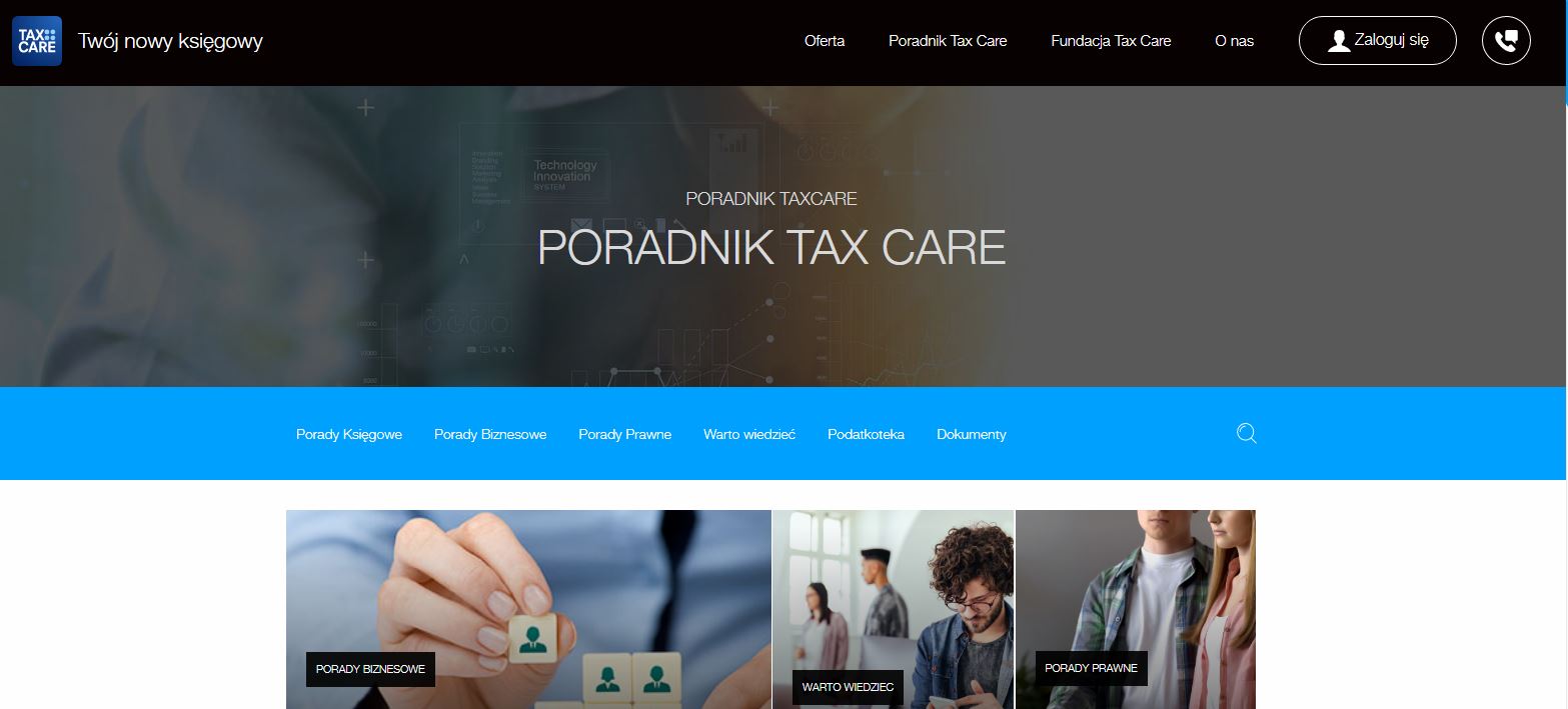 Zakładanie, jak i prowadzenie własnej działalności wiąże się z wieloma wyzwaniami. Dlatego, zawsze warto sięgnąć po radę eksperta. Tu z pomocą przychodzi poradnik Tax Care, który przeprowadzi Cię, przez różne aspekty biznesu, księgowości, czy też prawa, które wspomogą rozwój Twojej firmy. Poza tym znajdziesz też porady specjalistów dotyczące bardziej ludzkiej strony biznesu, czyli jak radzić sobie z problemami w zespole lub jak rozmawiać z klientem, tak by być zrozumiałym.