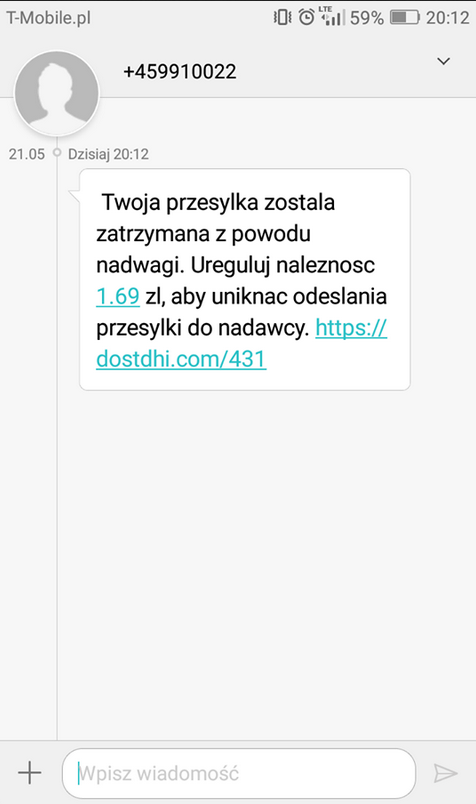 Parokrotnie na naszym blogu przestrzegaliśmy przed oszustami, którzy za pośrednictwem wiadomości SMS, lub kurierów z fałszywymi przesyłkami za pobraniem wyłudzali pieniądze. Co jakiś czas znajdują nowe sposoby, aby okraść kolejne osoby. Ponownie ostrzegamy, tym razem oszuści postanowili rozsyłać fałszywe SMSy z informacją o dopłacie za przesyłkę.