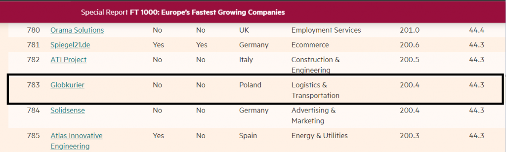 GlobKurier w top 1000 najszybciej rosnących firm w Europie wg Financial Times!