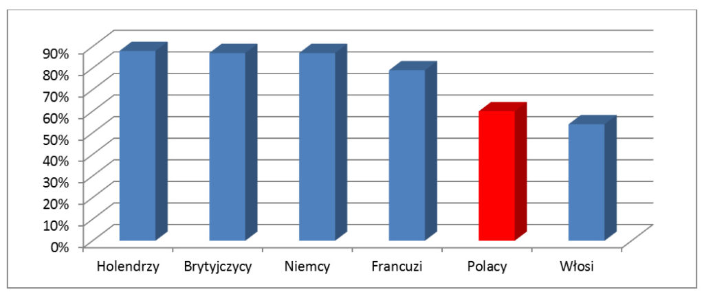 Jako naród plasujemy się w samym środku zestawienia popularności zakupów on-line wśród krajów Unii Europejskiej: 60% Polaków z dostępem do sieci przynajmniej raz kupiło coś przez Internet. Więcej od nas kupują chociażby Holendrzy (88%), Brytyjczycy (87%), Niemcy (87%) i Francuzi (79%). Zaskoczeniem są Włosi, którzy z możliwości robienia zakupów przez internet korzystają w mniejszym stopniu niż my (54%). Możliwe jednak, że w przyszłości nas przegonią. Ich zapał do korzystania z e-usług rośnie szybciej, niż u nas.