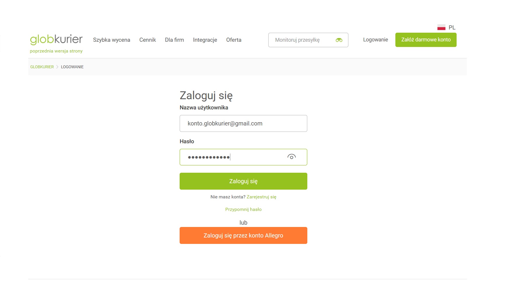 Integracja z Allegro w GlobKurier.pl była dostępna od dawna, ale postanowiliśmy wyjść naprzeciw potrzebom użytkowników i wprowadziliśmy możliwość rejestracji oraz logowania przez Allegro. Wystarczy tylko kliknąć przycisk „Zaloguj się przez Allegro” lub „Zarejestruj się przez Allegro”, aby w dwóch krokach zsynchronizować konta, dzięki temu rozwiązaniu integracja jest prostsza i znacznie szybsza.