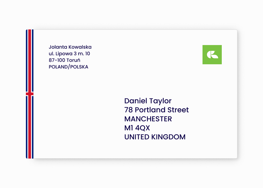 | Ważne: Adresując przesyłki do Anglii, Szkocji, Walii czy Irlandii Północnej, zawsze stosuj ten sam układ. Royal Mail obsługuje wszystkie regiony Zjednoczonego Królestwa według jednolitych zasad. Kod pocztowy i nazwa miasta muszą znajdować się w osobnych linijkach, a całość powinna być zapisana drukowanymi literami. |