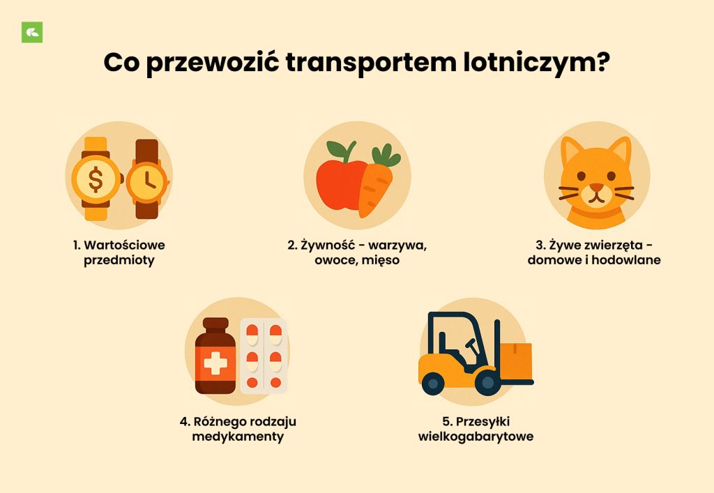 Transport lotniczy zyskuje na znaczeniu i stanowi kluczowy element w łańcuchu dostaw. Aktualnie największymi lotniskami cargo w Polsce są: Port Lotniczy Warszawa-Okęcie, Port Lotniczy Wrocław-Strachowice, Port Lotniczy Gdańsk im. Lecha Wałęsy, Port Lotniczy Katowice-Pyrzowice. Warto zauważyć, że wymienione porty lotnicze stanowią kluczowe węzły logistyczne dla przewozów cargo, zapewniając zaawansowane udogodnienia logistyczne i obsługę techniczną. Wiele linii lotniczych cargo korzysta z centralnych hubów logistycznych, gdzie towar jest sortowany i przesyłany do różnych miejsc na świecie. Przykładem może być Port Lotniczy w Kolonii/Bonn w Niemczech czy Port Lotniczy w Memphis, który służy jako główna baza logistyczna dla firmy FedEx. Największymi przewoźnikami cargo w Polsce są: Polskie Linie Lotnicze LOT SA Cargo, DHL, Kalitta Air, UPS. Działalność tych przewoźników obejmuje nie tylko krajowe, lecz także międzynarodowe trasy, co przyczynia się do zwiększenia globalnej dostępności i konkurencyjności polskiego rynku cargo.