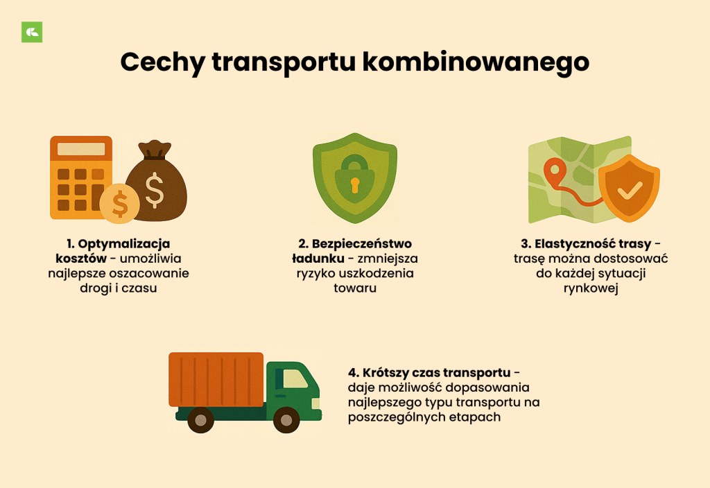 - optymalizację kosztów — transport kombinowany umożliwia wybór najbardziej kosztowo efektywnego środka przewozu dla konkretnego fragmentu trasy,