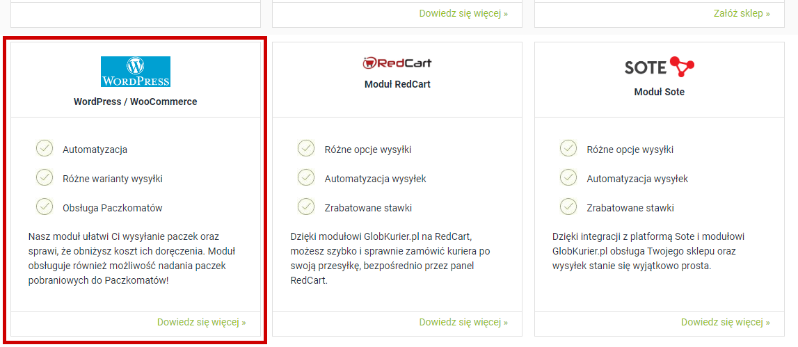 Integracja z firmą kurierską WooCommerce to przede wszystkim automatyzacja zamówień, która znacznie usprawni wysyłkę towarów z Twojego sklepu. Moduł ułatwi również obniżenie kosztów doręczania przesyłek, a Ty będziesz miał pełną kontrolę nad całym procesem wysyłania. Jeśli chcesz, aby Twoje zamówienia obsługiwali najpopularniejsi i najbardziej lubiani w Polsce kurierzy, WooCommerce i GlobKurier.pl to idealne połączenie. U nas znajdziesz ponad 50 firm kurierskich i przewozowych w jednym miejscu. Nie znasz którejś z nich i chcesz sprawdzić, jakim zaufaniem cieszy się wśród odbiorców? Sprawdź nasz ranking kurierów i dowiedz się, na co zwracają uwagę Twoi potencjalni klienci. Wtyczka obsługuje również możliwość nadania paczek pobraniowych do Paczkomatów! Chcesz wiedzieć, jakie jeszcze możliwości daje integracja z firmą kurierską WooCommerce? Sprawdź tutaj: https://www.globkurier.pl/integracje/integracja-wordpress