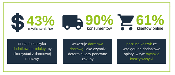 Atrakcyjna cena produktów w polskich e-sklepach kusi międzynarodowych klientów, ale do kwestii kosztów dostawy ogromną wagę przykładają także rodzimi konsumenci. Analizy TNS-Polska wskazują na ciekawą tendencję. Owszem, przesyłkę chcemy mieć jak najszybciej, ale nie chcemy za nią dopłacać. Aż 90% spośród wszystkich ankietowanych postawiło na wolniejszą, ale darmową przesyłkę. Opcja darmowej przesyłki może zdziałać cuda i dla niektórych serwisów w branży e-commerce stała się standardem. Za przykładem Zalando z takiej formy promocji korzysta coraz więcej „modowych” sklepów internetowych, ale w tą stronę ukierunkowują się także przedstawiciele sektora technologicznego czy kosmetycznego. Klient postrzega taką propozycję, jaką wyraźną korzyść i wartość dodaną do zakupu. Badania pokazują, że 43% klientów doda do koszyka dodatkowe produkty, tylko po to, aby przekroczyć pułap cenowy i skorzystać z darmowej dostawy. 90% konsumentów wskazuje na darmową dostawę, jako główny czynnik determinujący ponowne zakupy w danym e-sklepie. Klienci są wyczuleni na wysokie ceny dostawy i jeśli zostaną zaskoczeni w końcowym etapie ścieżki zakupowej, ujmują je w kategorii ukrytych kosztów. Wedle badań Fullestop w 61% za porzucone koszyki odpowiadają dodatkowe koszty, w tym właśnie wygórowane opłaty za przesyłkę.
