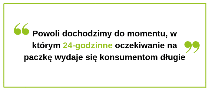 Każdy klient chce mieć swoją przesyłkę „już”. Konsumenci niecierpliwie wyczekują kuriera i odliczają godziny do otrzymania przesyłki, dlatego też opcja Same Day Delivery zyskuje na popularności. Jeszcze w 2015 roku powszechnie, jako szybką określaną przesyłkę doręczoną w 3-4 dni, stopniowo czas akceptowalnego czasu kurczy się, choć większość klientów zadowalała przesyłka dostarczona w ciągu 1, maksymalnie 2 dni, powoli dochodzimy do momentu, w którym 24-godzinne oczekiwanie na paczkę wydaje się konsumentom długie. Dostawa Same Dalivery Day testowana jest przez największych gigantów z branży od kilku lat i znajduje pozytywny oddźwięk wśród większości konsumentów. W tę właśnie stronę skłaniają się najwięksi. W projekt usprawnienia sieci dostaw Amazon zainwestował 14 mln dolarów i dziś wyznacza trendy, proponując przesyłki dostarczane dronem bądź pod nieobecność klienta. W Polsce opcja Same Day Delivery proponowana jest między innymi przez eobuwie.pl.