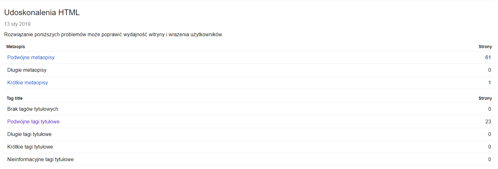 Jest to jeden z pierwszych elementów związanych z duplikacją, który zdecydowanie warto sprawdzić na początku analizy serwisu. Duplikacja tytułów może wynikać nie tylko z niedostosowania tytułów do poszczególnych podstron, ale również z innych problemów technicznych w serwisie. Tytuł jest tu więc papierkiem lakmusowym i może wskazywać także na duplikację całych podstron. Duplikację tytułów możemy zweryfikować na różne sposoby, np. za pomocą Google Search Console (Wygląd w wyszukiwarce> Udoskonalenia HTML):