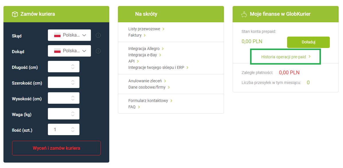 Historię operacji prepaid znajdziesz w okienku „Moje finanse w GlobKurier” dostępnym w Panelu Klienta: