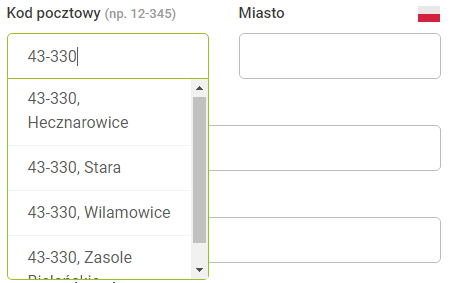 W celu ułatwienia Wam proces składania zamówienia i uzupełniania danych do formularza zamówienia dodaliśmy podpowiadajkę kodów pocztowych. Wpisując kod pocztowy, pojawia się lista miejscowości lub miasto, które przypasowane jest do danego kodu pocztowego. Wystarczy wybrać odpowiednią miejscowość, aby w formularzu pojawił się pełny kod oraz miasto. Nie dość, że takie rozwiązanie pozwala uniknąć błędów to dodatkowo ułatwia uzupełnienie zlecenia.