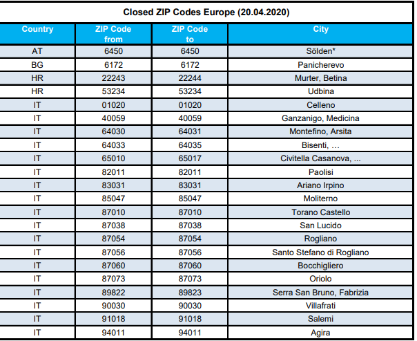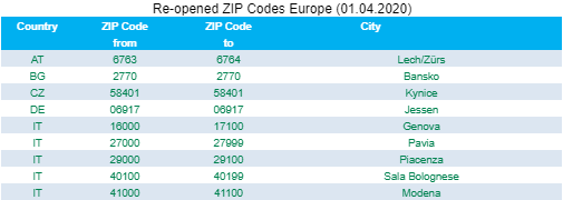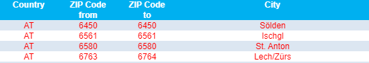Ponownie zamknięto obszar Soelden (kod 6450). Występują tam doręczenia tylko do firm raz w tygodniu w poniedziałek.
