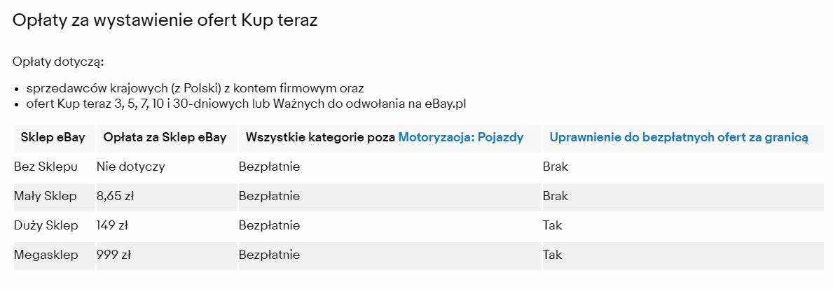 Na polskiej wersji przedsiębiorca w zależności od skali może działać w jednym z 3 rodzajów sklepów: Mały Sklep, Duży Sklep i Megasklep. Aktualnie, w 2 większych wersjach sprzedawcy nie ponoszą kosztów wystawienia oferty na zagranicznych stronach eBay.