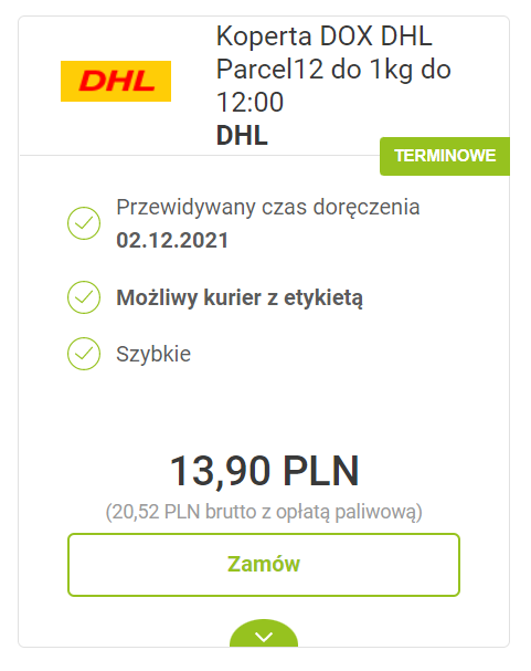 Zamówienie kuriera to nie zawsze prosty wybór. Doskonale zdajemy sobie sprawę, że zależy Ci na tym, aby Twoja przesyłka została dostarczona tanio i na czas. Za pośrednictwem naszej platformy możesz złożyć zamówienie, a przesyłkę odbierze kurier DHL. To firma o ugruntowanej pozycji na rynku z ponad 40-letnim doświadczeniem. Zatrudnia około 400 tys. pracowników. Decydując się na skorzystanie z usług tego dostawcy możesz wybrać dostawę do wczesnych godzin porannych, np. do godziny 9:00 lub 12:00. Możliwy jest także podjazd kuriera z etykietą czy dodanie ubezpieczenia czy skorzystanie z opcji dostawy w sobotę.