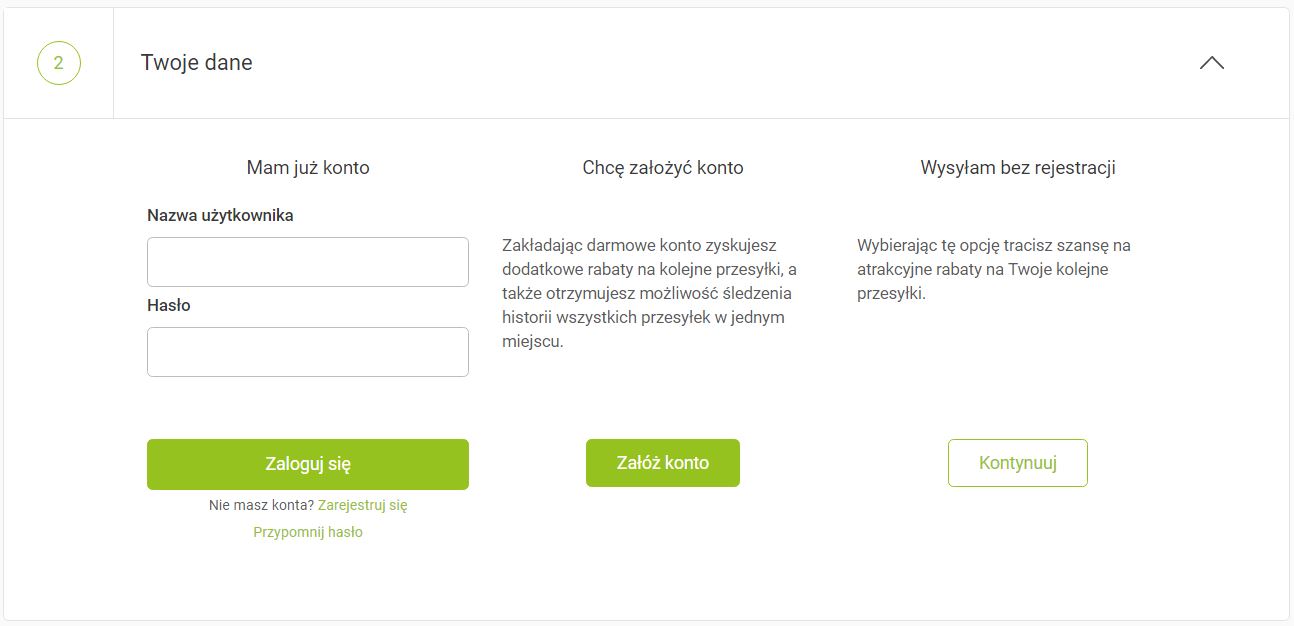 Po kliknięciu w przycisk „zamów” zostaniesz przeniesiony do strony, na której możesz założyć konto. Istnieje również możliwość wysłania paczki bez konieczności rejestracji w serwisie, dzięki czemu DPD zamawianie kuriera jest jeszcze szybsze i łatwiejsze.