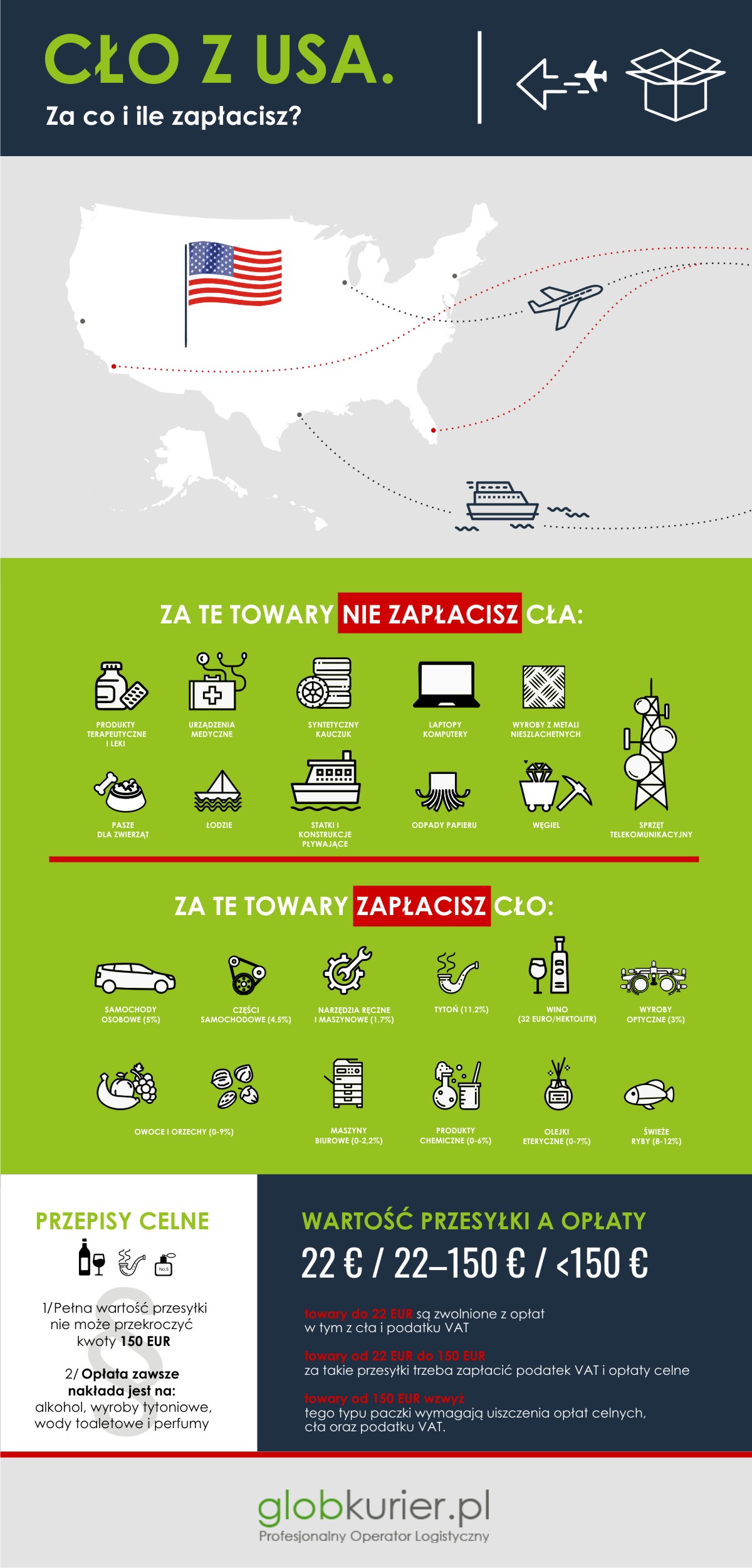 Duża grupa towarów sprowadzanych zza oceanu nie jest objęta cłem, co podnosi atrakcyjność importu z USA. Należą do nich między innymi: