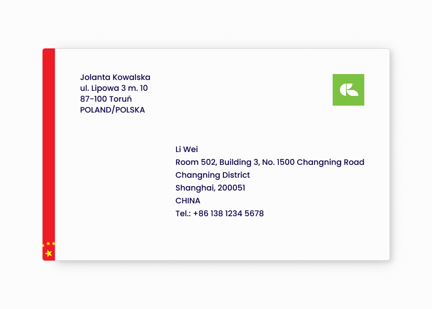 Adresowanie listu do Chin różni się od tego, które znamy z Polski. Najważniejsza zasada – adresujemy od ogółu do szczegółu. Najpierw wpisujemy kraj, następnie prowincję lub region, miasto, dzielnicę, ulicę, numer budynku, piętro i numer pokoju. Kod pocztowy wpisujemy przed nazwą kraju.