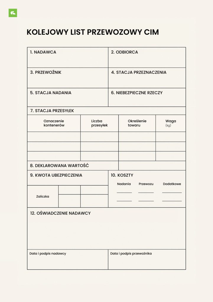 Poniżej przykładowy wzór kolejowego listu przewozowego CIM. Dokument ten składa się z kilkunastu pól, które zawierają kluczowe informacje niezbędne do realizacji międzynarodowego przewozu kolejowego.